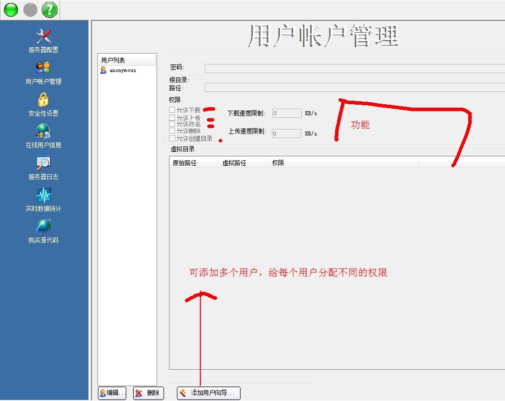 本ftp服务器软件功能非常强大,可用来做公司里面员工直接的文件共享传输服务,可让不同的用户分配不同的权限,如给单一的用户1 设置只允许下载公司里面文件,给用户2设置只允许上传数据等。