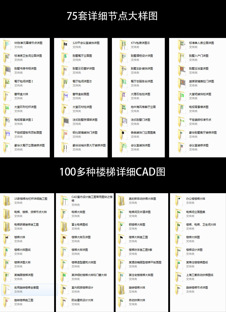 内容:楼梯、柜子、幕墙、节点图、衣柜、鞋柜、书柜、储物柜、矮柜、电视背景墙等施工图。