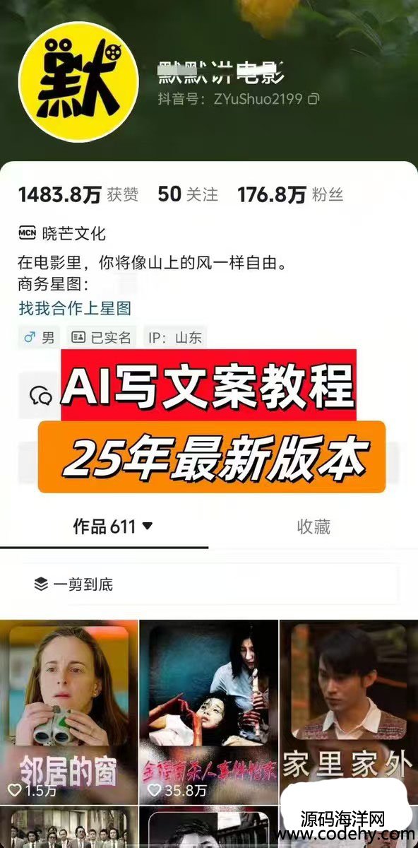 默默讲电影是最近dy上因为用AI来写文案爆火的主播,她的课程是和小机灵说电影同门的,课程是我从他的学员手上高价买来的