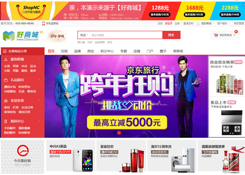 好商城V52016年8月3日版 33hao-V5 新版首页+完整版手机版+新版后台+微信支付功能+修复BUG,好商城V5, 包括左边上商品分类,右侧导航,新版商家入驻,新版会员中心,新版完整手机端,新版后台管理界面等,同步升级到最新版的手机触屏版,手机版完全可以在后台自定义各个布局进行组合排版,可自定义首页,专题,分类图片,手机支付,客户端下载设置等。