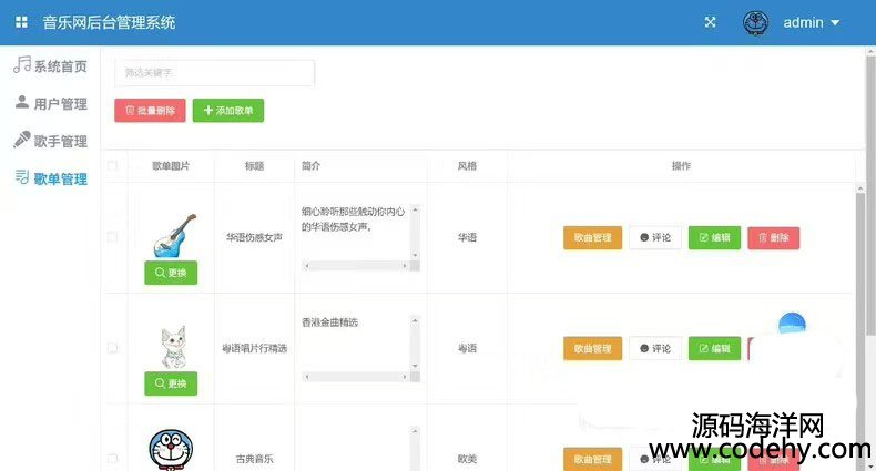 管理员模块用户管理、歌手管理、歌单管理、上传歌曲