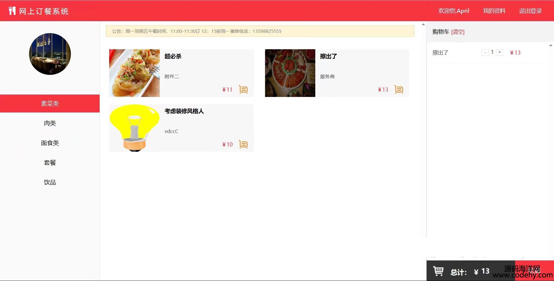 前台用户功能:菜单分类、浏览菜单、购物车、个人资料、用户登录、用户注册
