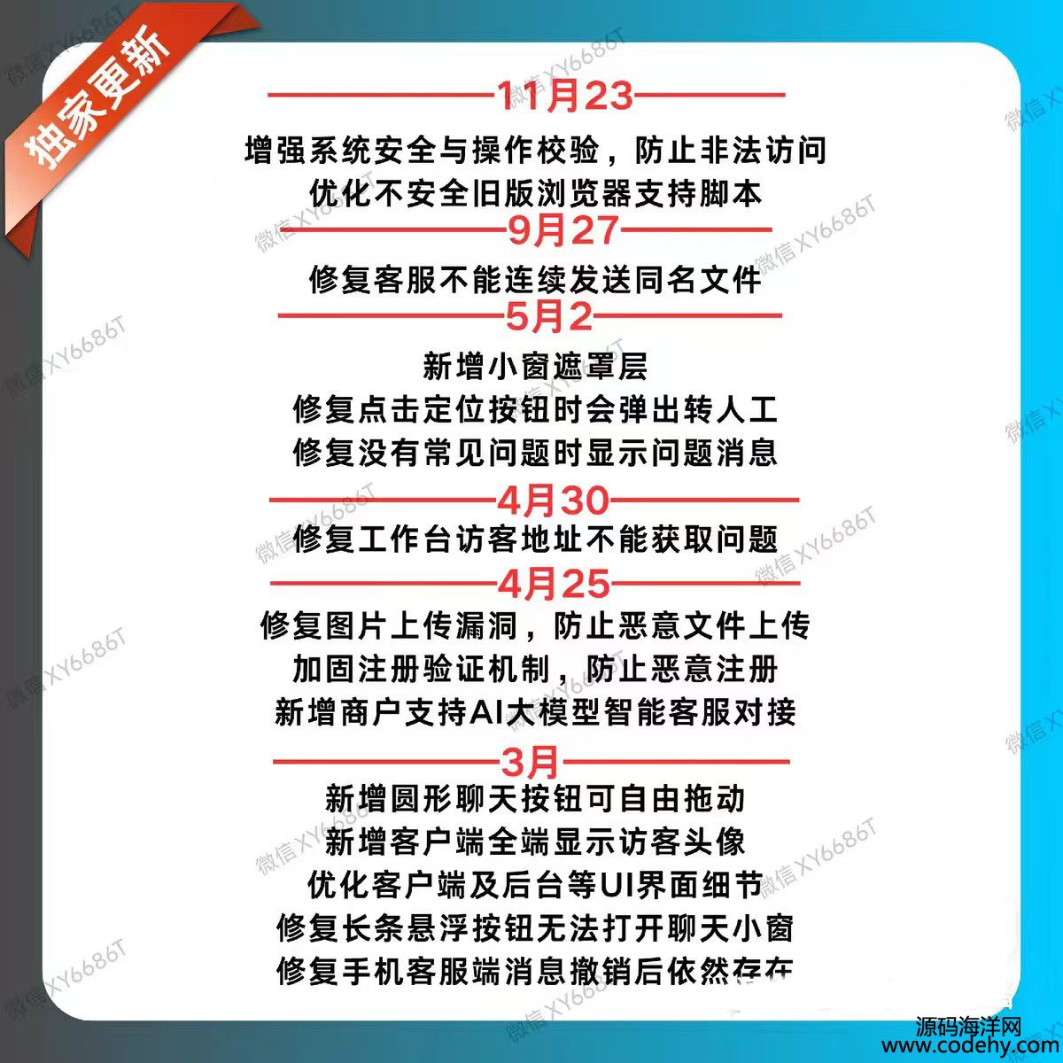 支持 消息预知、留言管理、已读未读状态、客服转接 等多项强大功能,助力商家高效管理客服工作。还可接入AI 智能客服 24 小时在线,无人值守也能高效接待客户!系统界面简洁美观,兼容 PC 端与移动端网页,广泛适用于 电商、企业官网、在线服务平台 等多种场景。