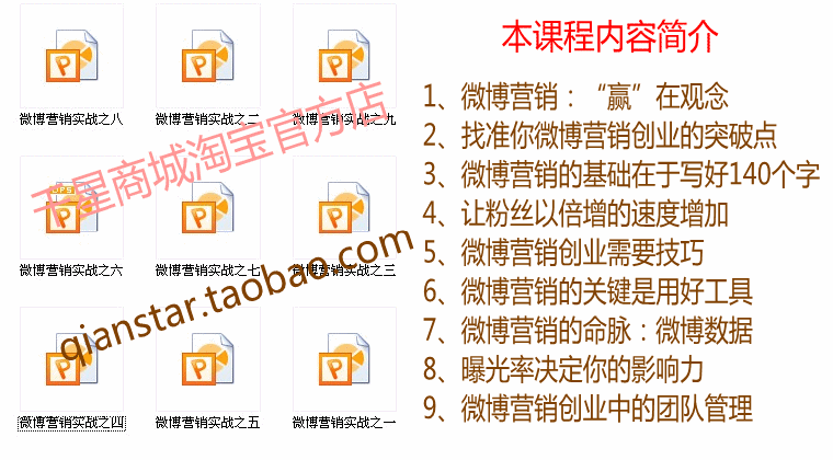 给出好评后,请截图给客服,赠送:微博营销_玩到百万身价、艾瑞微博营销策划培训、微博营销—颠覆营销模式。